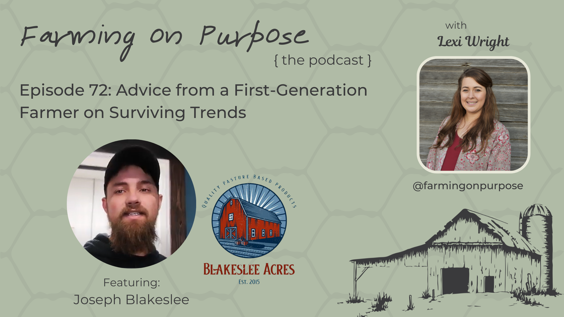 Join us in this informative episode of Farming on Purpose with Joseph Blakeslee. Taking us behind the scenes of his butcher shop, Bare Bone Butchering as well as his farm, Blakeslee Acres. Joseph shares about how he knew he wanted to be a farmer from a young age, how he and his wife started their farm, and some of the things Joseph learned along the way. Joseph touches on a very important topic in agriculture, mental help, and shares some tools that help maintain his mental health. Listen in as we delve into a variety of topics from first generation farming, butchering and farmer burnout.